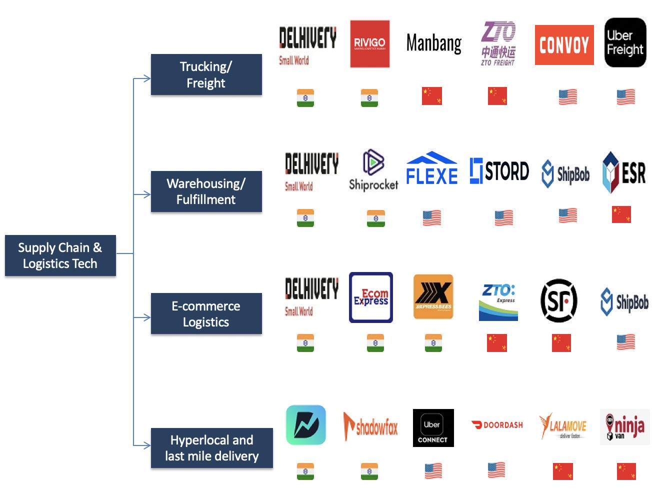 To get a better sense of supply chain service providers, I mapped out the key players from India, US, and China in the major verticals. Please note that this is not an exhaustive list, the startups mentioned here are for illustration purposes.